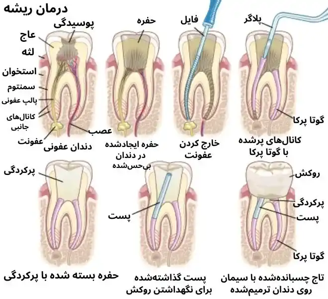 | عفونت پالپ | در اثر پوسیدگی عمیق، ضربه یا ترک دندان، پالپ ممکن است ملتهب یا عفونی شود. |